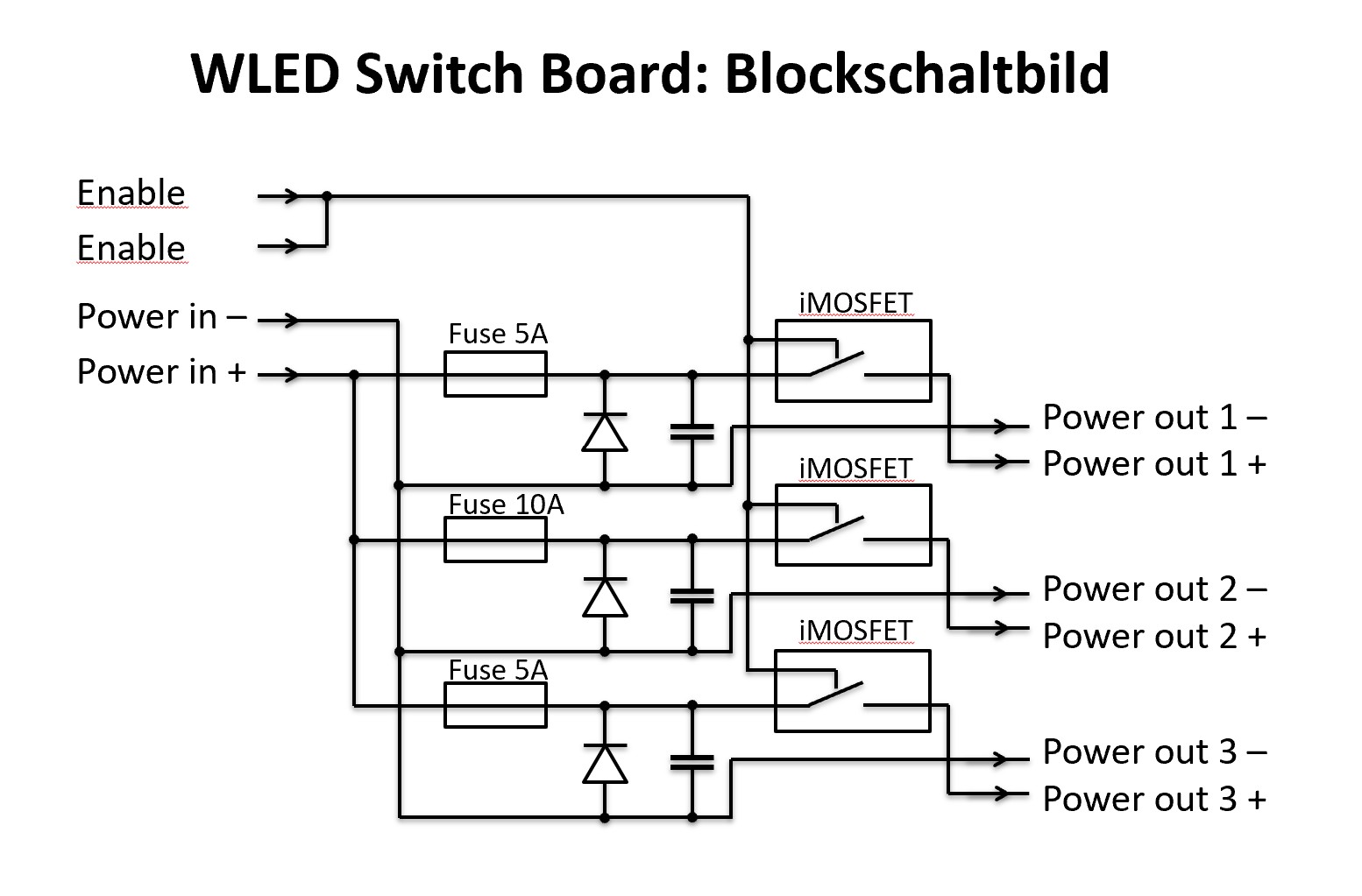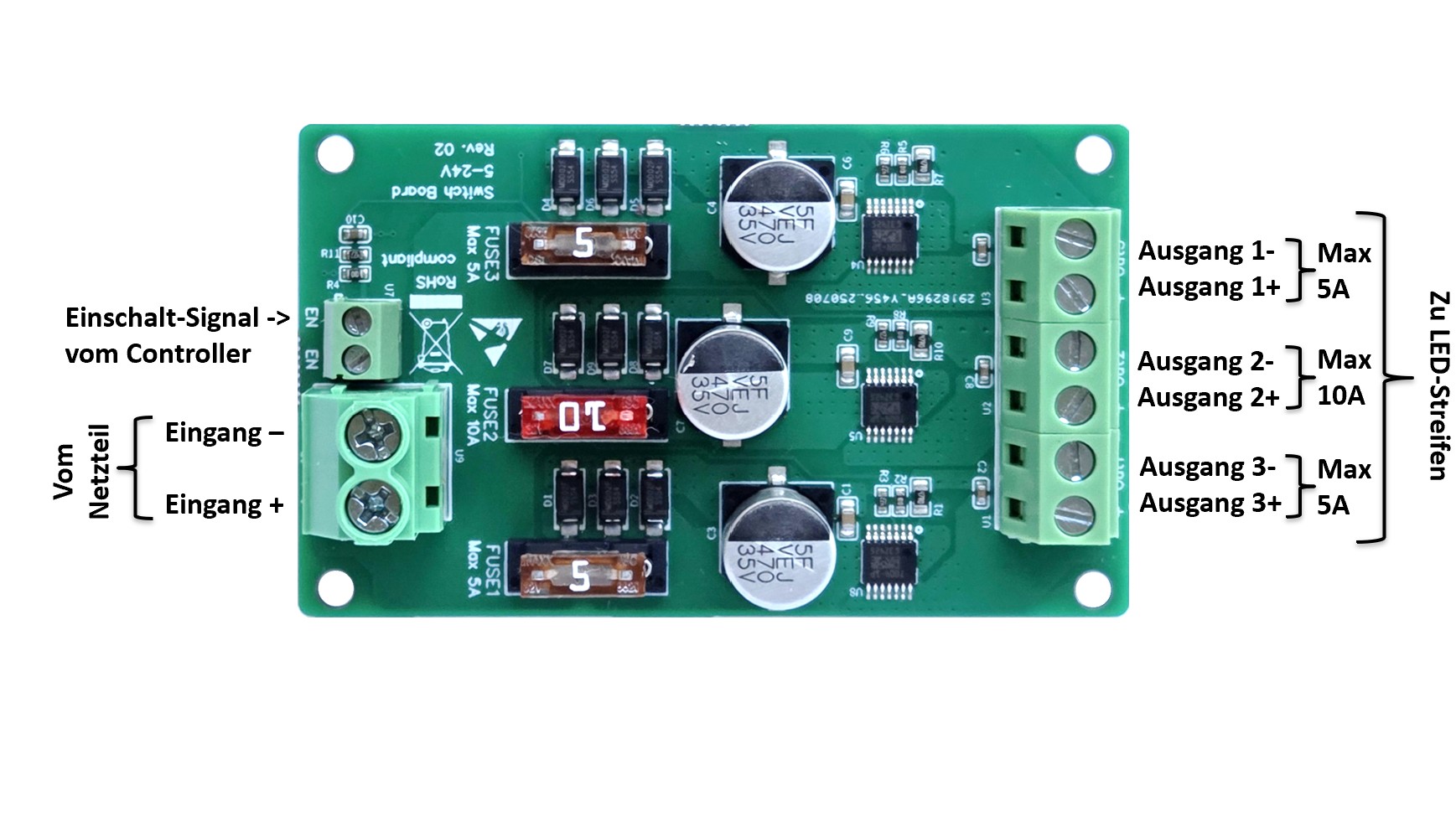 Dieses Produkt ist für die Verwendung im Zusammenhang mit WLED Controllern konzipiert. Es erlaubt die LED Streifen im „Off“ Zustand durch intelligente MOSFET Schalter abzuschalten. Das spart Energie und erhöht die Lebensdauer von LED Streifen. Die Kombination aus Sicherungen, Schutzdioden und intelligenten MOSFETs bringt zusätzliche Sicherheit (Verpolungsschutz, Überstromschutz, Kurzschlussstromschutz, Übertemperaturschutz). Drei Kanäle ermöglichen drei Einspeisungen zu kontrollieren. Außerdem können mehrere Boards parallel verwendet werden.