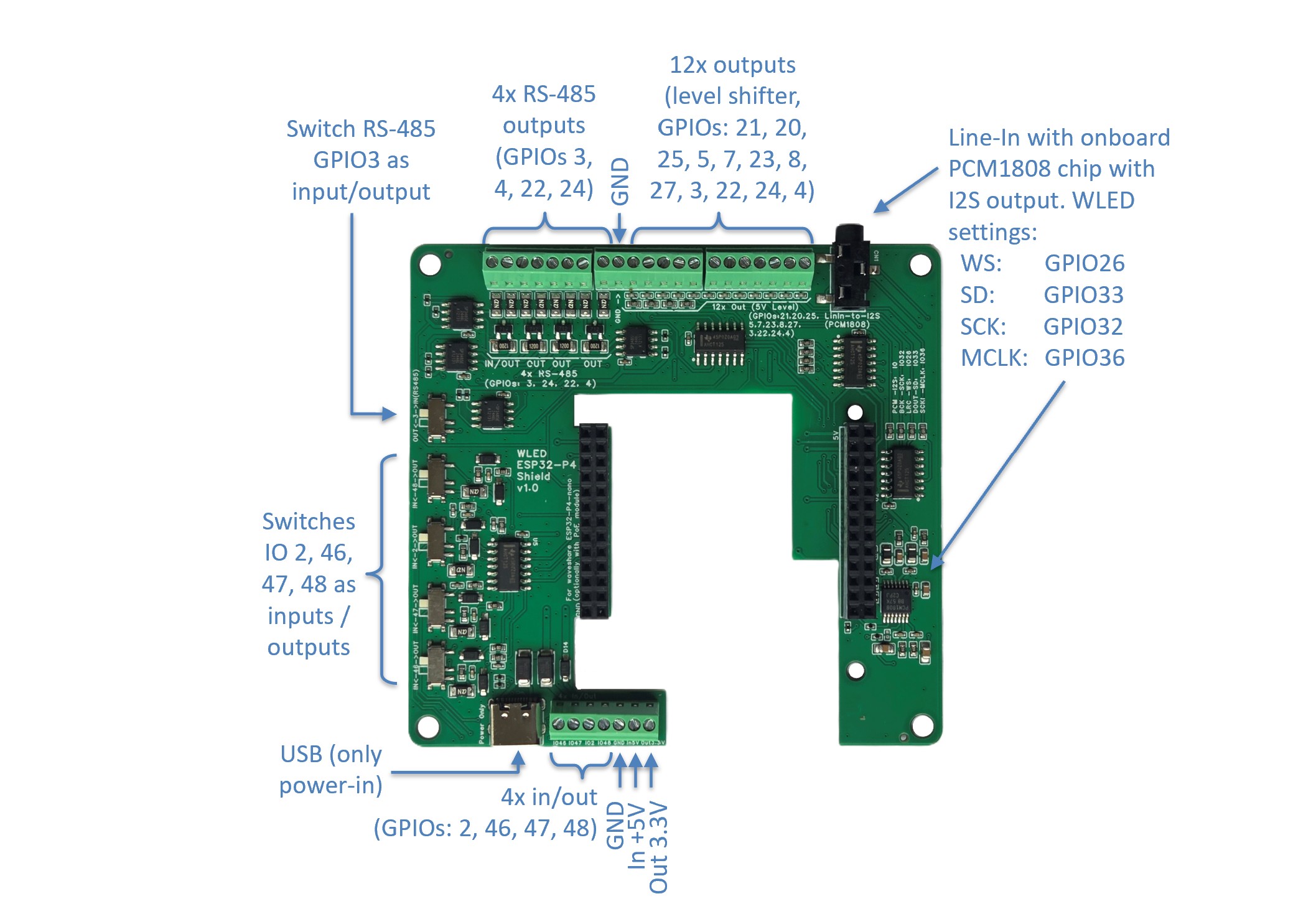 - Line-in input and a built-in analog-to-I2S chip for audio reactive WLED