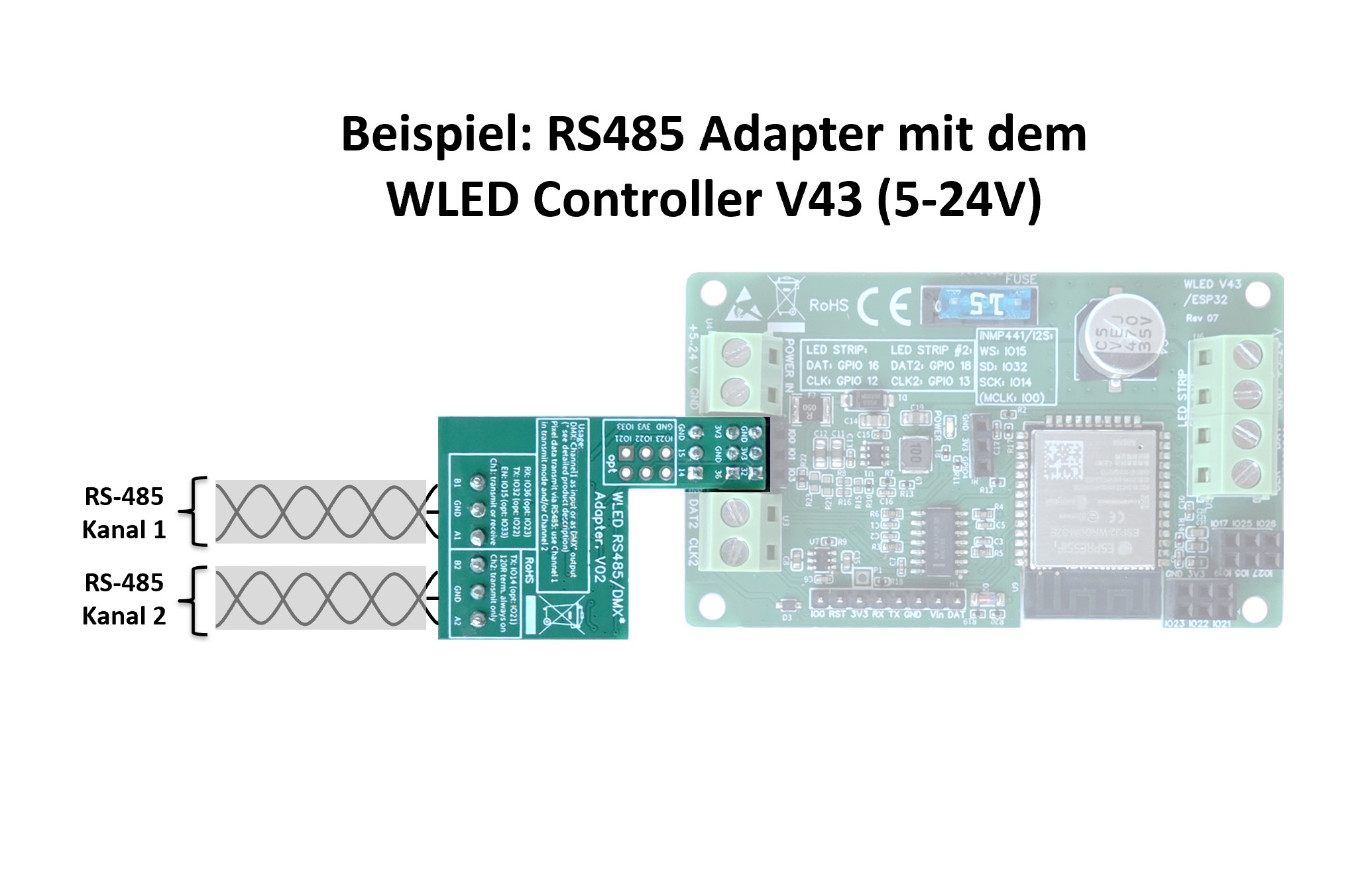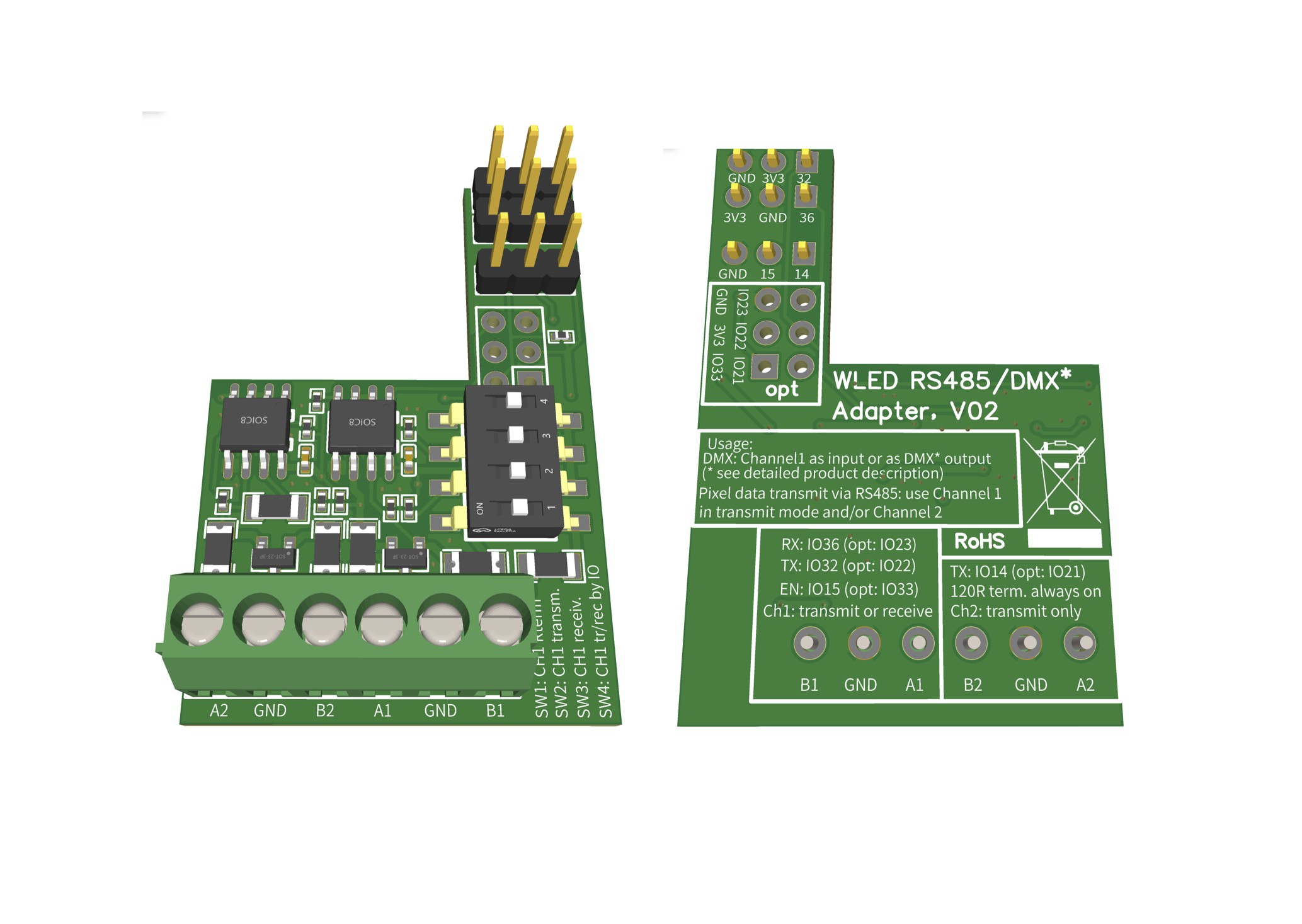 This adapter extends the ABC! WLED Controller (5-24V) V43 with two RS-485 interfaces. These can be used either as a so-called "long-range extender" to transmit the data signal to LEDs over long distances, or as DMX inputs or outputs (for DMX input WLED software version 0.16.x or higher or MoonModules required).